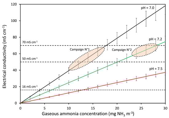 Lines: calculated values (Equation (11)) for the electrical conductivity of water where the ammonia driving force between phases becomes nil (i.e., equilibrium between ammonia concentration in the gas phase and free ammonia concentration in the liquid phase). pKa = 9.53 at 22 °C []; Henry coefficient H = 5.89 10−4 at 22 °C []. Error bars indicate the influence of the change in temperature of the scrubbing liquid (±1 °C) on pKa and H calculation. Ellipses: maximum possible EC values for the experiment conditions recorded for phase 3 of campaign #1 (pH 7.0 and 10–17 mgNH3 m−3) and campaign #2 (pH 7.2 and 24–27 mgNH3 m−3).