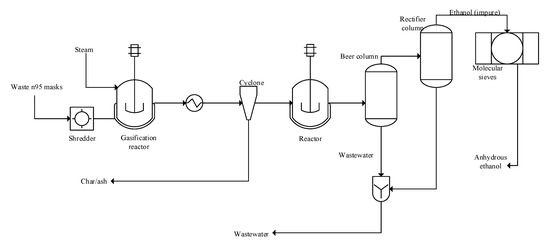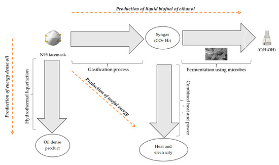 These surgical respirator masks, classified as “FFP1” in compliance with EN149 EU standard, are also called the N95 facemasks because of its ability to achieve a 95% filtration of particles with a mass median diameter of 0.3 micrometers [3]. The N95 facemask may consist of multiple layers of nonwoven fabric, which are often made from polypropylene plastic (C3H6)n [6]. However, in most cases, N 95 masks contain a layer each of cellulose (C6H10O5) sandwiched between layers made of spun-bond polypropylene [5]. These N95 facemasks are typically single use, as they are considered to be contaminated and thus are plastic medical waste that must be disposed with the current pandemic, resulting in significantly increased upstream demand not “matched” with an effective downstream waste disposal approach [3,7]. According to Klemes et al. [7], the morbidity and significant mortality rate of the COVID pandemic often overshadows the seriousness of the long-term environmental effect of the poor waste plastic management [7]. For instance, it has been suggested that there is a risk of generating over 128,000 tonnes/y of unrecyclable plastic-related waste in the UK as a direct consequence of utilising disposable surgical masks [8]. Therefore, scientists have opined that this waste plastic surge due to COVID-19 presents an opportunity to accelerate immediate and even long-term changes in plastic waste management globally [7]. In order to satisfy waste disposal requirements, several approaches such as incineration of the waste have been employed, because it ensures the obliteration of the virus due to the high temperatures involved in the incineration process and also circumvents the low biodegradability concerns of the plastic-containing waste N95 facemask [9,10]. However, the incineration approach may result in the release of toxic and poisonous gases such as dioxins, furans, and polychlorinated biphenyls, which lead to associated unfavourable environmental outcomes [11,12]. Therefore, it is necessary that possible pathways for facemask waste management are investigated to mitigate the harmful impact of plastics on the environment. The current study proposes the investigation of waste N95 facemask management via its conversion to energy and fuels via the thermochemical transformations of gasification [13], hydrothermal liquefaction [13] and gasification–fermentation [14]. The aforementioned thermochemical transformation pathways are capable of facilitating the safe management of waste N95 facemask due to the high temperatures typically imposed while simultaneously enabling the downstream generation of steam electricity from syngas (via combined heat and power systems), energy-dense oils from hydrothermal liquefaction, and liquid fuels from gasification–fermentation [13,14]. Therefore, the current study presents a comparative assessment of the economic and environment impact performances of the technologies while using net present value (NPV) economic measures and a waste reduction (WAR) algorithm, respectively. Such a comparative assessment of possible waste N95 facemask management strategies are yet to be undertaken in the literature. In the present study, the representative waste N95 facemask has been modelled as consisting of three layers of polypropylene (PP) and one layer of cellulose (based on the BioFriendTM BioMaskTM N95 model) [15] with the mass fraction of cellulose specified to 0.25 of the total mass of the waste N95 facemask. This assumption became crucial, since the mass composition of the layers may vary widely as stated earlier above.