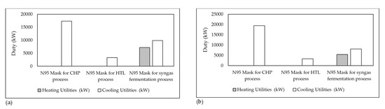 Figure 5a shows that no external heating requirements are required in both the waste N95 facemask conversion to steam and energy via CHP and oil energy-dense production via HTL processes. These observations are not unexpected, since both processes are highly exothermic at steady-state conditions [60,61,62], more so at high temperatures, and cooling utilities will be required to maintain set temperatures. Figure 5a shows that the cooling requirements in the waste N95 facemask conversion to steam and energy via CHP and oil energy-dense product via the HTL processes before (after) heat integration are 17,340 kW (19,450 kW) and 3336 kW (3324 kW), respectively. It is interesting to note that heat integration in the CHP process results in the requirement for a higher external cooling utility requirement. This is because heat integration limits the loss of heat via waste ash steam, making the heat available for the overall process, thus implying a higher need for external cooling. In the waste N95 facemask–syngas–fermentation process, the externally required heating and cooling utilities before (after) heat integration were calculated to be 7197 kW (5404 kW) and 9892 kW (8100 kW), respectively.