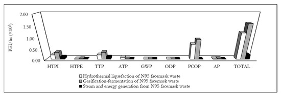 Based on the WAR results presented in Figure 6, the gasification–fermentation of N95 facemask waste for ethanol production (scenario iii) is estimated to present the highest rate of potential environmental impact (1.59 PEI/h) followed by the PEI of HTL of N95 facemask waste for the production of an energy-dense oil product (scenario ii) with a value of (1.20 PEI/h) and the PEI of the process for steam and energy generation from N95 facemasks via a gasification and cogeneration system (scenario i), with a value of (0.28 PEI/h). Figure 6 also shows that the photochemical oxidation potential (PCOP) index constitutes the major impact category of the PEI for scenario iii and scenario ii processes. The high PCOP indexes of scenario iii (≈0.9 × 10−3 PEI/h) and scenario ii (≈0.7 × 10−3 PEI/h) relative to scenario i (≈0 PEI/h) is a reflection of the increased potential of photochemical smog formation in sunlight and low-humidity conditions due to the generation of precursory (secondary) pollutants of volatile organic compounds (i.e., ethane, ethylene) [63]. Such a generation of volatile organic compounds (VOCs) is absent in scenario i as the combusted syngas does not result in VOCs. Similarly, scenarios iii and ii are also observed to present higher indexes of HTPI of ≈0.32 × 10−3 PEI/hand ≈0.2 × 10−3 PEI/hrespectively compared to the HTPI index value of ≈0.1 × 10−3 PEI/h, implying that scenario iii will present the least favorable effect on humans possibly due to the combined effects of the waste streams. Similar trends are also observed when the TTP (i.e., measure of terrestrial toxicity) indexes for all scenarios are considered.