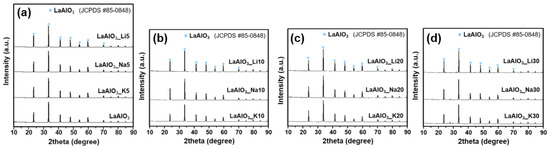 X-ray diffraction (XRD) patterns of the prepared LaAlO3_XY (X = Li, Na, K, Y = mol %) and LaAlO3 catalysts: (a) LaAlO3_X5, (b) LaAlO3_X10, (c) LaAlO3_X20, and (d) LaAlO3_X30.