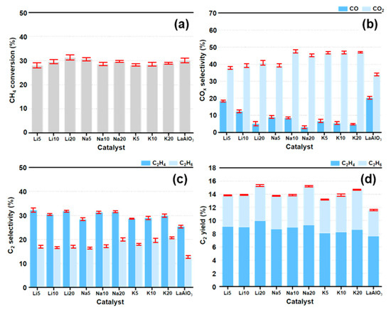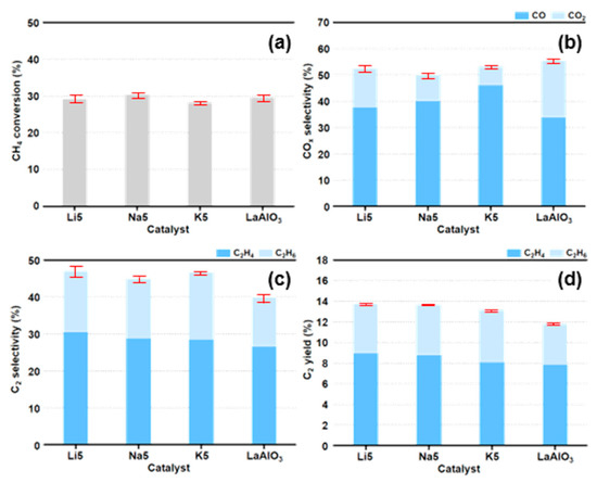 Catalytic activities in terms of the prepared catalyst in the oxidative coupling of methane (OCM): (a) CH4 conversion (%), (b) COx selectivity (%), (c) C2 selectivity (%), and (d) C2 yield (%).