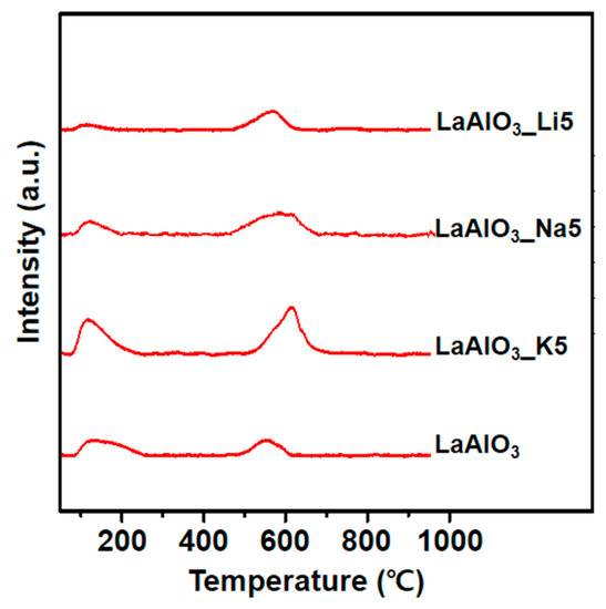 Many studies analyzed the strength of oxygen species on the catalyst surface using XPS and TPD analysis in the OCM. However, it is difficult to compare the strength of nucleophilic lattice oxygen species because of XPS. Thus, we performed CO2-TPD analysis to compare the strength of the nucleophilic lattice oxygen species (Olat(n)) [51]. CO2-TPD analysis is an analytical method that analyzes the base point century of the catalyst surface by comparing the temperature at which CO2 is desorbed. In this study, CO2-TPD analysis was performed on prepared LaAlO3_X5 (X = Li, Na, K) and LaAlO3 catalysts, and the results are shown in Figure 6. Table 4 shows the temperature and amount of CO2 desorption for the prepared catalysts. From the CO2-TPD results, peaks displayed between about 500–700 °C mean nucleophilic lattice oxygen species (Olat(n)) according to the studies. Therefore, we obtained that the higher temperature at which CO2 is desorbed indicates the possession of a strong nucleophilicity of lattice oxygen by the catalysts. In the CO2-TPD analysis results, the temperature at which CO2 was desorbed increases in the order of LaAlO3_K5, LaAlO3_Na5, LaAlO3_Li5, and LaAlO3. These indicate that the LaAlO3_K5 catalyst had a strong nucleophilicity of lattice oxygen, and the LaAlO3 catalyst had a weak nucleophilicity of lattice oxygen. These results suggested that the catalysts possessing a strong nucleophilicity of lattice oxygen prefer CO2 in COx and those retaining a weak nucleophilicity of lattice oxygen produce CO more easily.