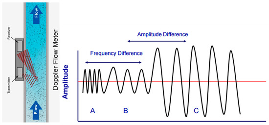 The shift in Doppler is the fluctuating frequency of an acoustic wave when there is a movement or shift between the source and the acoustic receiver, and the frequency shift is in proportion to the acoustic source velocity [25,31]. The acoustic source velocity can be obtained by calculating the change in frequency between the acoustic source and the receiver. In the CWDU technique, an acoustic frequency beam is continuously discharged from the transducer (ultrasonic) into the flow, and the sound wave is reflected by moving the scatters [32]. The scattered acoustic beam is received by another ultrasonic transducer and then the flow velocity is calculated with the change in frequency based on the Doppler effect. The Doppler ultrasonic principles are illustrated in Figure 1.