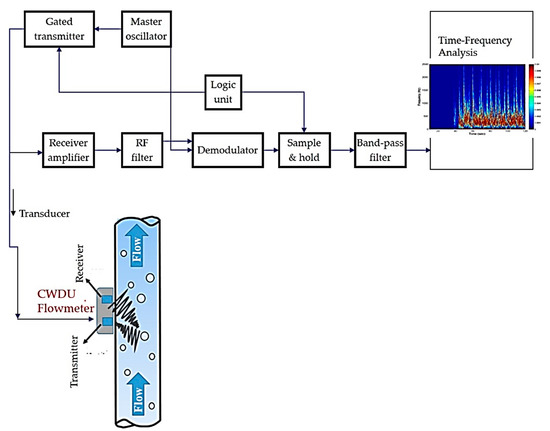 The CWDU implemented in this paper is a non-intrusive/non-invasive flowmeter manufactured by United Automation Ltd. based in Southport, the United Kingdom [24]. The CWDU is suitable for the measurement of ultrasonic reflective fluid of any flow. It calculates the shifts in frequency, processes the ultrasonic signals, and evaluates the velocity of the flow. The CWDU calculates the shift in frequency of the signals reflected from the discontinuities or scatters, like bubbles, in the flowing fluid. The CWDU has two separate crystal transducers embedded in one probe which transmit and receive ultrasonic signals continuously at 500 kHz.