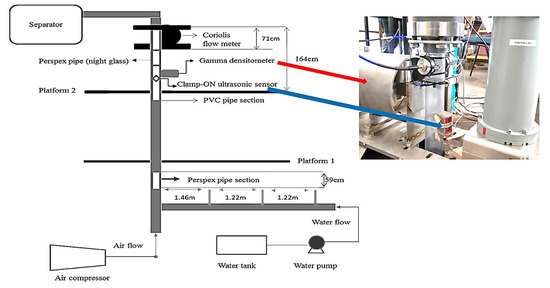 The 2-inch vertical pipeline multiphase flow system used to carry out this experiment is at the Cranfield University process system engineering laboratory equipped up to an industrial scale. The flow facility contains a 10.5 m vertical riser, 54.8 mm internal diameter, 40 m horizontal pipe, and 0° inclinations. The temperature rating of the facility is in the range of 0–80 °C. The duty of the water pump is 100 m3/h at 10 barg and the duty of the two air compressors at 7 barg are 570 m3/h FAD and 840 m3/h FAD, respectively. The range of the water flow meter is between 0–7.36 kg/s and 0–30 kg/s, and the range of the airflow meter is between 0–150 Sm3/h and 100–4250 Sm3/h. The second flow loop test section has a transparent pipe for flow regime observation. The continuous-wave ultrasonic Doppler measurement system was mounted on the test section at the topside facility. The airflow rate was adjusted by controlling the valves to achieve the desired flow regime. More details of the experimental facility can be found in [24,25,35]. The experimental setup is illustrated in Figure 3.