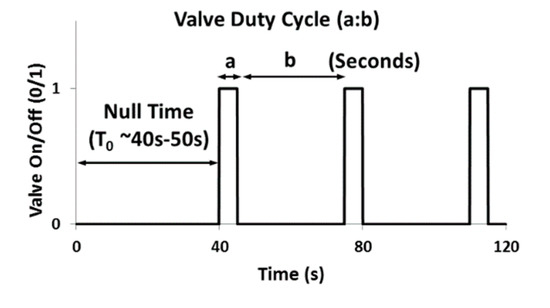 A total of nine test points were acquired to cover a range of test conditions. For a certain water flow rate, the air was injected using a quick-closing valve located at the base of the riser. The air valve was operated using a duty cycle arrangement, as shown in Figure 4. The data acquisition from CWDU had a maximum limitation of 120 s due to experimental hardware limitations and hence the total duration of each experiment was set to 120 s. Moreover, a stable reference period was desired to observe the onset of slugs and it was established that a stable period of 30 to 40 s would be sufficient in the flow conditions. Hence, a maximum of the first 40 s was kept as a single-phase water flow arrangement followed by opening and closing of the air valve for “a” and “b” seconds, respectively, thereby obtaining a valve duty cycle of “a:b”. The data acquisition time was set to 120 s for each test point.