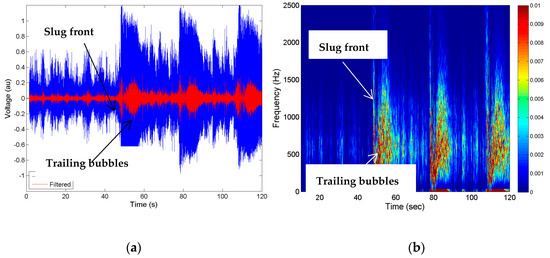 Figure 6a shows the CWDU raw signals in blue, whereas the bandpass-filtered signals of the representative case of 1 kHz centre frequency with 100Hz bandwidth are shown in the red plot. It can be observed that the slug front and the trailing bubble signals are much more observable in the bandpass signals than the raw Doppler signal. Figure 6b shows the spectrogram image of the data using a short-term Fourier transform, which clearly shows the sharp signals of the slug front and broadened signals of trailing bubbles after the slug front. This spectrogram shows that around 1 kHz or above, there is a discernible difference between the slug front and the trailing bubbles and hence a bandpass filter can be effective in such a scenario for observing the slug front clearly.