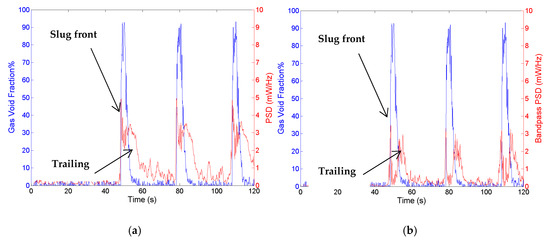 Figure 11 shows the results from the proposed bandpass power spectral density (BPSD) method using the bandpass range of 0.95–1.05 kHz. The majority of the trailing bubbles are filtered out using this method and the slug fronts gain more prominence, thereby making slug detection much easier even with a simple threshold-based algorithm. However, it should be noted that in practice, the bandpass filter frequencies may be a function of liquid flow rate and the gas void fraction.