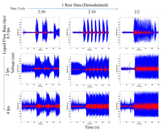Figure 8 shows the raw time-domain signals (blue lines) as well as the proposed bandpass-filtered signals (red lines) obtained with a sixth-order Butterworth bandpass filter in the frequency range of 0.95 kHz–1.05 kHz. The basis of using the bandpass filter is that the slugs in a vertical pipe have the highest velocity due to buoyancy as compared to the smaller bubbles, which attain a terminal velocity with respect to the liquid, depending on the bubble size and surface tension, among other factors. The higher velocity of the slug front shows up as higher Doppler frequency signals in the CWDU measurements. The plots from Figure 8 indicate that the bandpass-filtered signals make it easier to distinguish slugs from smaller bubbles and hence is a good parameter for slug detection.