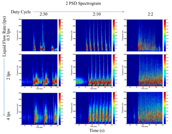 Figure 9 shows the short-term Fourier transform spectrogram images for the nine test points and reveals the frequency distribution of bubbles when a slug passes through. The higher the frequency, the higher the velocity of the scatterer. It can be observed that high-velocity components invariably arise during the passing of a slug front, which is expected. This is followed by the lower-frequency components, representing the trailing bubbles of the air slug. This forms the basis of the proposed bandpass PSD, where a bandpass filter is applied to filter out the higher-frequency components of the signal, representing slug fronts. This method makes the distinguishability of the slugs from the background scatterers more prominent, which is evident from Figure 10 and Figure 11.
