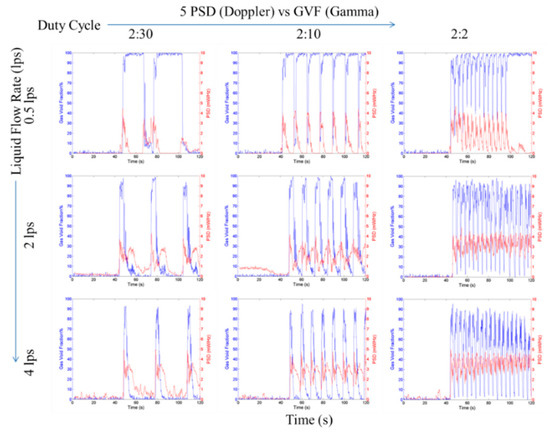 Figure 7 shows the comparison of signals from gamma measurement and that from CWDU. It can be observed from Figure 7a,b, which show CWDU signals with PSD and bandpass PSD, respectively, where the latter shows a much more discernible structure of the slug front and the trailing bubbles. In further sections, further analysis of bandpass PSD was carried out.