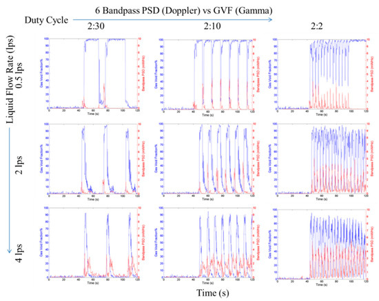 The STFT average bandpass power spectral density (0.95–1.05 kHz) for various slug trains. The gas void fractions (blue lines) are estimated from the gamma densitometer. The Y-axis limits of each plot in this figure are 0 volts to 1 volt and the X-axis limits are 0 s to 120 s.