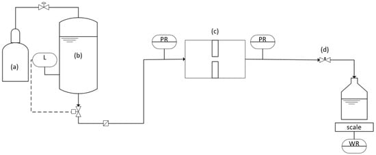 Experimental setup of the original scale system () with pressurized gas cylinder (a), pressure vessel (b), optically accessible orifice (c) and needle valve (d). The level of the pressure vessel (L) is measured constantly to avoid a complete emptying. The values of the pressure sensors (PR) and the scale (WR) are recorded during the experiment.