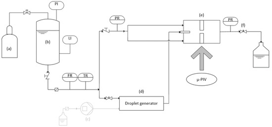 Experimental setup of the 5-fold scaled system () with pressurized gas cylinder (a), pressure vessel (b), droplet generator (d), optically accessible orifice (e) and needle valve (f). The positive displacement pump (c) was not used when performing velocity measurements. The values of the pressure sensors (PR), scale volume flow sensor (FR) and temperature sensor (TR) were recorded during the experiment. The pressure in the vessel (PI) and the level in the vessel (LI) are indicated at the test rig. The µ-PIV system was used to measure the velocity profile in the optically accessible orifice.