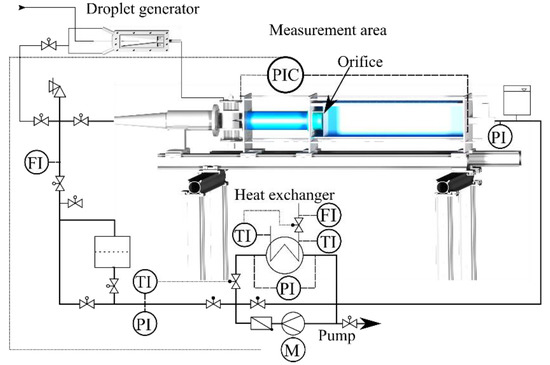 The experimental setup of the 5-fold scaled system with an optically accessible orifice is presented in Figure 2. As in the original scale setup, the pressure vessel (b) was pressurized with a nitrogen pressurized gas cylinder (a). The continuous phase was filtered before passing the volume flow (VSI 0,2/16 EPO 12V-32W15/4, VSE Volumentechnik GmbH, Neuenrade, Germany) and temperature sensor. The volume flow and the current temperature of the continuous phase were recorded with a USB-6210 device (National Instruments Germany GmbH, München, Germany) and Labview 2019 (National Instruments, Austin, TX, USA). The inlet pressure of the orifice and the backpressure at the outlet channel were measured with two digital pressure sensors (Wika S-20 (0–160 bar), Klingenberg, Germany) and again recorded with the USB-6210 device and Labview. The continuous phase was additionally pumped through a bypass towards the droplet generator (d), which was not in use when velocity measurements were performed. After flowing through the droplet generator, the fluid was reinjected in front of the orifice with a stainless-steel capillary. The needle valve (f) was used to achieve the desired backpressure for the Thoma number .