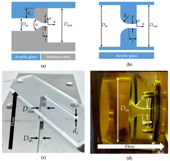The original scale and the 5-fold scaled orifice are made of stainless steel, the inlet channel and the orifice with the outlet channel being produced separately. Steel construction makes it impossible to make either the conical inlet or the smallest cross-section optically accessible. Both parts are screwed together and sealed with glue (Loctite 3472, Henkel AG & Co. KGaA, Düsseldorf, Germany). After a polishing step, the orifice is then sealed with an acrylic glass plate that has a protrude bar with a height , as depicted in Figure 4c, which, depending on the outlet geometry, fits in the inlet channel and creates a quadratic inlet channel. An overview of all dimensions can be found in Table 2.