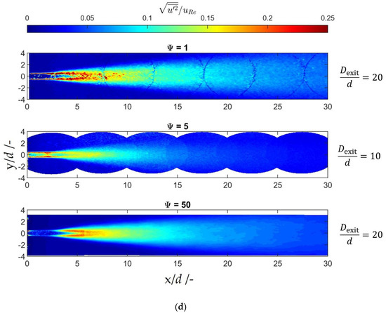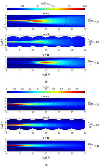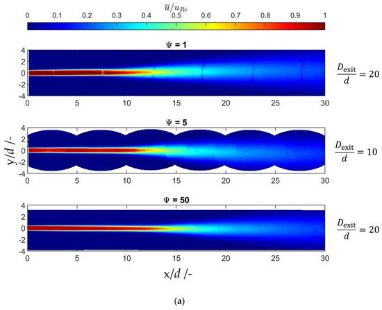 The measurements show similar velocity fields for the three scales, although the 5-fold scaled system uses a deviating outlet channel diameter ratio instead of . The influence of the outlet channel diameter ratio is discussed in Section 3.2.3. The region with a constant normalized velocity of about 1 represents the potential core, see Figure 5a,c. A shear layer surrounds the potential core where the velocity is decreased by the ambient fluid. This region with lower velocities grows with increasing distance from the orifice exit, which results in a smaller diameter of the potential core. The energy of the jet is dissipated in the emerging turbulent eddies in the shear layer. Furthermore, the outer diameter of the jets increases downstream from the orifice by entrainment of the ambient fluid.