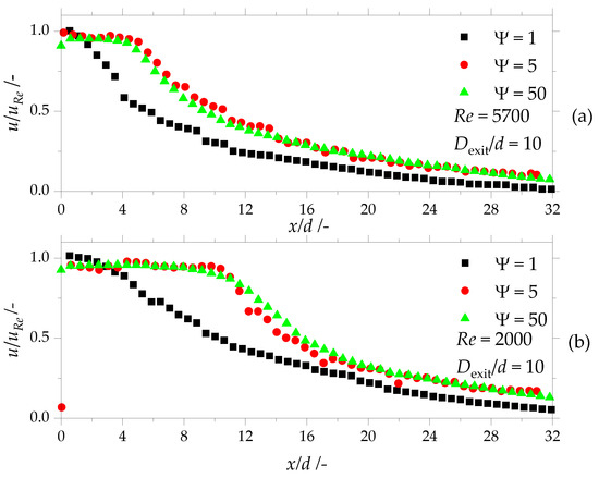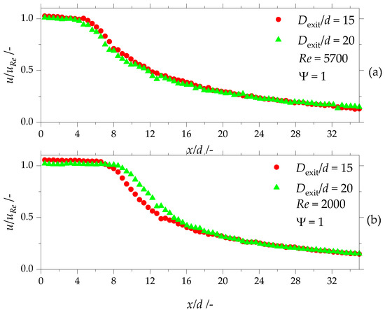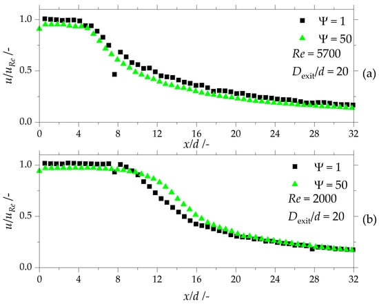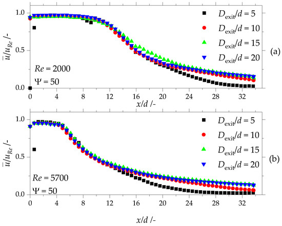 The normalized velocity remains constant for both scales in the region of at a Reynolds number Re = 5700 in Figure 6a. This area represents the potential core of the free jet where the flow develops [32]. The absolute values of the normalized velocity differ slightly in the different scales, showing a value of 1.01 in the original scale , while it is at 0.95 in the 50-fold scaled orifice . Figure 6a also reveals a steep decrease of the normalized velocity in the region . The absolute value of the slope at which the normalized velocity declines decreases with increasing distance from the orifice outlet . Comparing the results farther downstream , it can be observed that the slope is similar for both scales. The normalized velocity decreases to a value of about 0.14 at a normalized distance of in both orifices. The original scale orifice shows higher normalized velocities than the scaled orifice within the whole investigated region.