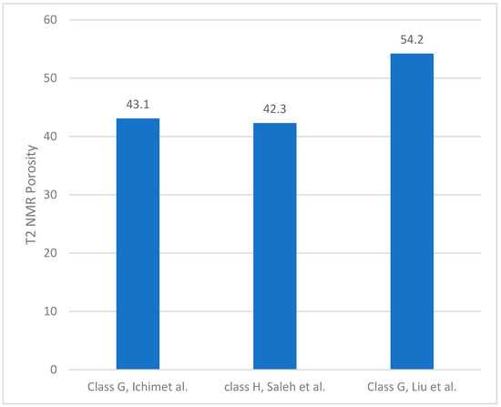 As noted earlier, one of the primary goals of this report is the comparison of T2 NMR porosity from different studies. The reason for this comparison is that T2 is the most commonly measured NMR parameter and is also used to report the so-called NMR porosity. A better cement is a cement with the lowest porosity and permeability. However, permeability cannot be measured through NMR. Figure 1 shows the comparison of porosity measurements from studies conducted recently by Ichim [24] (class G cement), Saleh, [25] (class G), and Liu et al., [26] (class G).
