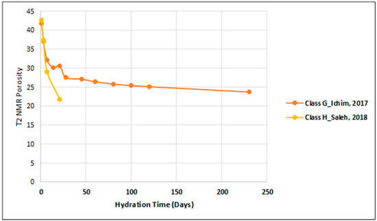 Both [24,25] reported similar values for one-day NMR porosities compared to porosity reported by [26]. This difference can be attributed to using consistent mixing procedures for cement based on API, and perhaps similar NMR set-ups and procedures (both were conducted at the University of Oklahoma laboratories). Even though class G cement was used in these studies [26], different cement/water ratios and mixing procedures resulted in significantly higher porosities, highlighting the effect mixing and curing can have on cement properties. Figure 2 illustrates T2 NMR porosity versus hydration time for two studies on neat class G and class H cement. It shows that porosity values were in close agreement at earlier hydration times until seven days of hydration. At 21 days, there was a very a different trend, which shows lower T2 NMR porosity for class H compared to class G. The ability to perform direct observations of the hydration process is very important, especially because of the leading role played by water inside the cement structure. These observations will also apply for cement microstructure investigations. Since class H cement has a different particle size distribution (PSD) (coarser particles) compared to class G, it will impact water absorption and porosity in the long term (7–21 days). Figure 2 shows that water absorption still exists after seven days of curing.