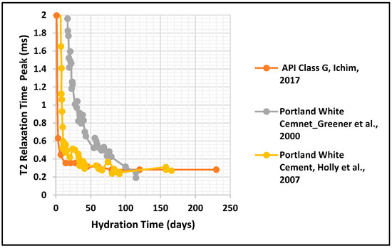 We compared available data for the T2 relaxation time for API Portland cement and white cement as shown in Figure 3. Two of these studies were related to white cement [21,27]. The samples were constructed of Portland cement according to ASTM C150 Type II. The main characteristics of the white cement are its low content of iron and manganese oxides; consequently, the cement has a gray color. Typical white cement applications are used in home decor such as stucco, cement paint, tile grout, and decorative concrete. Table 2 shows the oxide composition of Portland white cement in comparison to API Class G cement. White cement has a higher percentage of calcium and considerably higher silicate percentage than API Portland cement used for oil well applications.