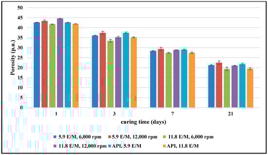 Estimated NMR porosity measurements for cement samples exposed to different mixing energy levels as a function of curing time. These results show that by increasing the curing time, the NMR porosity will decrease, with the lowest porosity obtained at 11.8 E/M and 6000 rpm.
