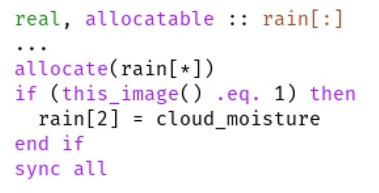 Fortran coarrays started out as a language extension and were formally added to the Fortran Standard in 2008 [,]. Coarrays are similar in concept to the MPI, but offer the advantage of a simplified syntax with square brackets []. A variable without square brackets will always refer to the current image’s copy of a coarray variable. Adding square brackets, such as var[i], will allow any image to access or change the ith image’s var variable data. For instance, the following code allows the first image to send the local data in the cloud_moisture variable to the second image’s rain variable Figure 2.