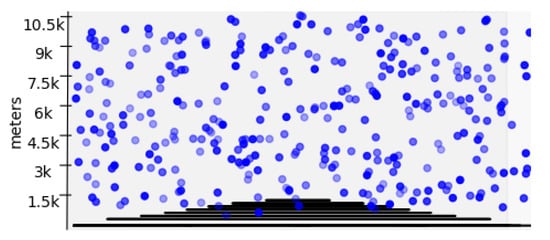 There were two different types of initialization of atmospheric and environment variables that were tested in our model. One was an ideal case, where the potential temperature was set at 300 K for the entire model. The other setup was done by using a real atmospheric sounding of Seattle. The soundings were extracted from the University of Wyoming’s weather website; a site with atmospheric soundings from locations around the world []. This was done using Python libraries BeautifulSoup, to extract the sounding data, and Pandas to handle the data manipulation and preprocessing. The atmospheric sounding was interpolated to produce data at every meter of elevation and written to a file for later use. The atmospheric sounding of Seattle gave the real-world potential temperature at elevations above 1600 m. This was beyond our model’s upper limit, so the extra data were unused in this case, but could be used if the domain of the model were expanded. Potential temperatures below the sounding’s lowest elevation were set at 300 K.