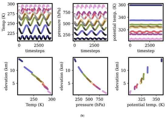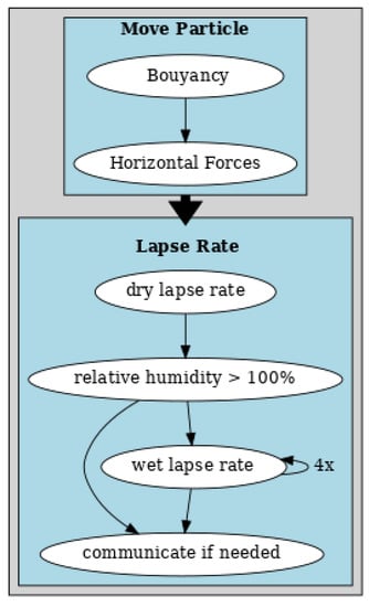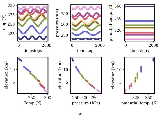 The results of the dry and wet runs are shown in Figure 9a,b, respectively. Both figures show a behavior that would be expected for a working model. The potential temperature of a particle experiencing dry adiabatic lifting is constant, which is what occurs in Figure 9a. The potential temperature only changes during the moist adiabatic lapse rate, during the process of the phase shift from water vapor to rain water, or vice versa. The third graph in Figure 9b confirms this behavior. Additionally, the trajectories of the temperature and pressure of the saturated and unsaturated particles follow what would be expected [].