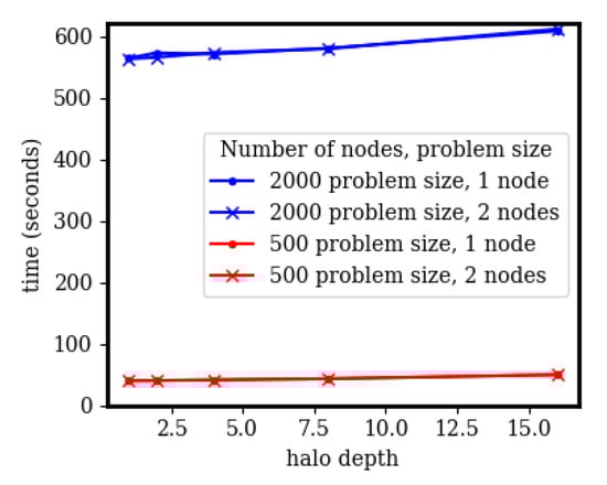 The addition of air particles to the ICAR model required the increase of the halo depth from one to two, and this study wanted to quantify the effects of increasing halo depth size. Increasing the halo depth size results in creating more data that need to be communicated during the halo exchange. Another benefit of understanding the performance cost is that different numerical methods, possibly used for greater precision, could require larger stencils that would also increase the halo depth size. In Figure 10, the performance is shown as the depth of the halo region is increased using grid dimensions of size 500 × 500 × 30 and 2000 × 2000 × 30. For those two sizes, this graph shows the scaling of one node using 44 cores and two nodes using 22 cores each. The reason for increasing the node count while keeping the work per image constant is to summarize the cost of intranode communication with halo depth variance. Figure 10 shows that while increased halo depth affects run-time, splitting the work across nodes in this case had minimal effect on performance.