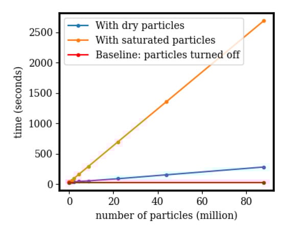Figure 11 shows the computation costs of saturated and unsaturated particles as the number of particles increases. For these runs, wind speed was changed to zero, so no communication cost was measured. This figure was run on a single node of the Cray machine with 44 images. The number of particles per image ranged from one to two million, for a total of 88 million particles. The domain was 200 × 200 × 30, and the problem was run for 200 time steps, with 19 additional time steps of 1 s for the particles. There was clearly linear growth for both dry and saturated air particles. The cost of saturated particles grew at a faster rate, with the time cost of 88 million particles being ∼9.5 times the dry particles. One-point-one million saturated particles took ∼1.7 times, and the dry particles and 2.2 million saturated particles took ∼2.5 times. Therefore, around 1.5 million particles, the cost of saturated particles doubled the cost of dry particles. The additional performance cost of the saturated air particles was intuitive since the anytime a particle’s relative humidity was over 100%, an iterative process was used to calculate the exact change in temperature and water mass.