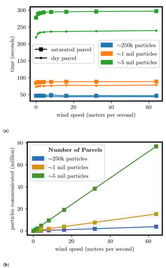 To examine the effects of wind speed on the model, we first turn to Figure 12a. This figure was created using a problem domain of 500 × 500 × 30 over 200 time steps. The runs were done with initially dry or saturated particles and a total particle count of around 250 thousand, 1 million, and 5 million particles. The 250 thousand particles were chosen as the starting point since that would equate to a particle per horizontal grid cell. In all of the varying particle count, the results showed the expected behavior of saturated particles taking more time than unsaturated. As the particle count grew, so did the difference between dry and saturated. This was also an intuitive result since each saturated particle had to perform an iterative process to correctly convert water vapor and cloud water. What was more unexpected was that after an initial performance hit from increased communication, there was negligible cost as the wind speed increased. This was most clearly shown in the five million particle run, where from 0 m/s to 1 m/s, there was a 4.03% performance cost, but from 4 to 8 m/s, there was a 0.45% increase.