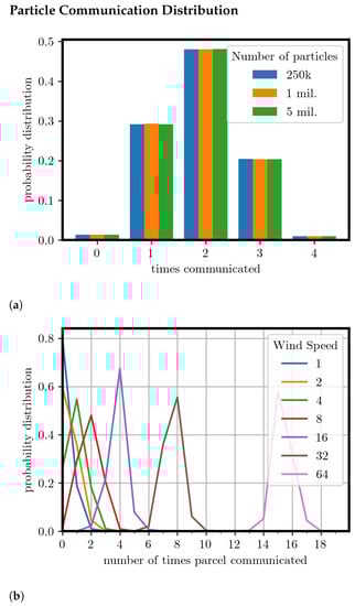 Analysis was done on the distribution of the number of particles communicated. Figure 13a was created using a base wind speed of 8.0 m/s on a 500 × 500 × 30 domain. This figure exhibits how with varying particle counts, the distribution of how many times a particle is communicated will stay relatively constant. The consistency in the distribution suggests we can fix the particle count, without loss of generality, to perform the runs done in Figure 13b. Figure 13b was made with a particle count of 250 thousand. Figure 13b shows the probability distribution of the number of times a particle is communicated as the wind speed changes. Again, this confirmed that particles were being communicated as expected. These figures and Figure 12a,b express that despite linear growth in the number of particles communicated with an increase in wind speed, only the initial increase had a noticeable effect on the runtime.