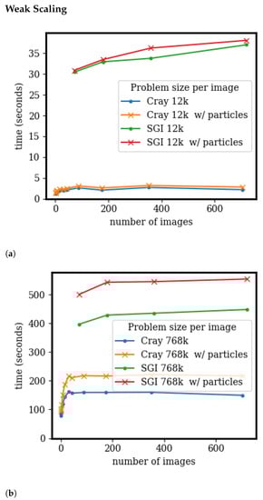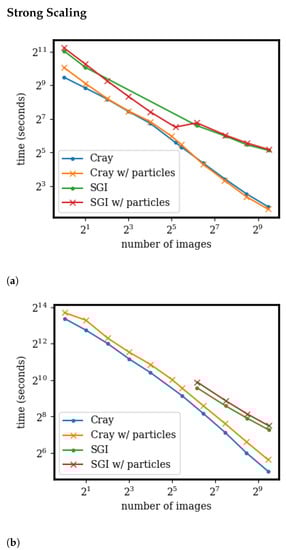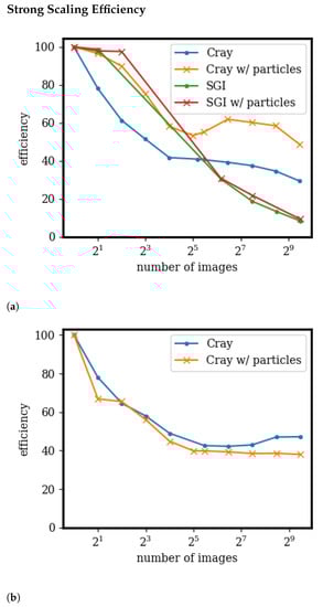 The strong scaling experiments, Figure 14a,b, were created using one image and doubling until 36 images. After that, the full processor count of the nodes was used, which for the Cray cluster was 44 processes times the node count and for the SGI cluster 36 processes times the node count. The number of nodes was doubled every time, up to 16 nodes with a total of 704 processes.