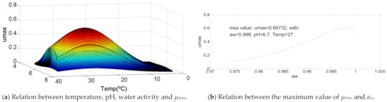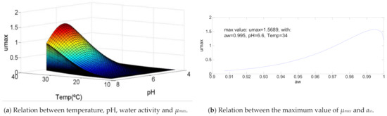 Of the various models that relate µmax with temperature (T), pH and water activity (aw), the Masana & Baranyi model will be used, presented in Equation (2) [20]: