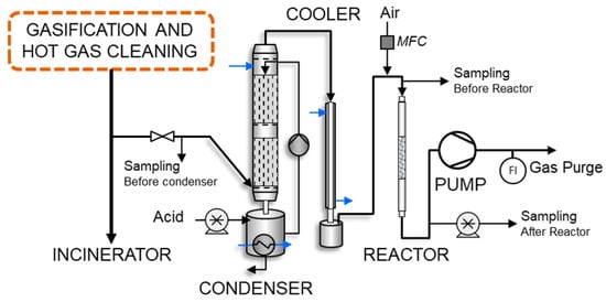 A bench-scale adsorption test rig was connected to a gasifier with biomass feedstock. The gasification facility consisted of a bubbling fluidized bed (BFB), a hot filtration unit, and a reformer unit (Ni-based catalyst) [20]. The modified bench-scale unit [21], shown in Figure 1, was connected to the reformer slipstream.