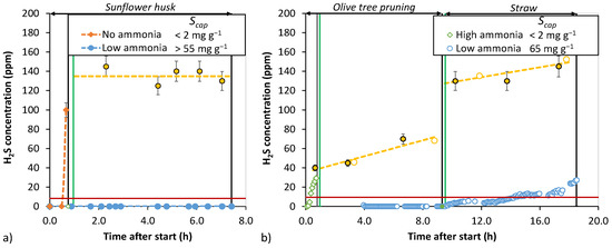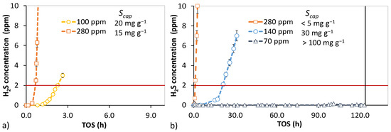 Effect of sulfur concentration on H2S breakthrough in oxygen-containing and moist syngas. (a) IAC at SV 24,000 h−1 in reactor 1. Particle size distribution—0.3–1.0 mm. (b) Non-impregnated activated carbon (AC1) at SV 3700 h−1 in reactor 2. Particle size distribution—1.0–1.25 mm. A vertical black line indicates premature termination.