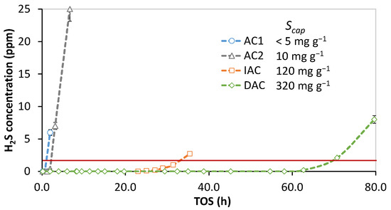 Recently, doped activated carbons have emerged as an interesting alternative to impregnated carbons [36]. The relative performance of non-impregnated, impregnated, and doped activated carbons was tested at lab scale in the favorable conditions established in the previous section with oxygen and steam present in low H2S concentration syngas. The results are visualized in Figure 4.