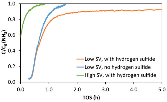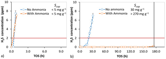 Only a few publications describe ammonia in terms of improving desulfurization performance. It is known that carbon surface treatment by ammonia can significantly improve H2S removal, but this applies to all basic compounds in the adsorbent preparation stage [28]. An old study by Engelhardt [18] first mentioned the effect of gaseous ammonia for desulfurization on activated carbons, reporting a capture capacity over its own weight when oxygen and ammonia are injected into a gas stream. Turk et al. [19,46] reported similar findings showing that gaseous ammonia injection improved non-impregnated activated carbon desulfurization performance in air purification for wastewater treatment plants. A significant advantage over caustic activated carbons has been shown in both laboratory and pilot-plant results. Masuda et al. [47] tested the influence of ammonia on hydrogen sulfide and concluded that ammonia was not adsorbed at all, and its influence on desulfurization was too small to be evaluated, since the removal efficiency in the experiments was high even without ammonia. In an oxidation mechanism study by Li et al. [10], at 150 °C adding ammonia to a model coke oven flue gas did not significantly improve desulfurization performance. Therefore, to further investigate the effect of gaseous ammonia on desulfurization, lab-scale breakthrough tests and spent adsorbent characterization were performed. The effect of ammonia on sulfur removal using non-impregnated activated carbon was tested in two space velocities in oxygen and steam containing syngas. The dynamic H2S breakthrough results are shown in Figure 5.