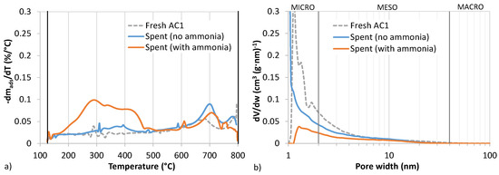 Characterization of fresh and spent AC1 from experiments with and without ammonia in syngas as presented in Figure 5b. (a) Thermogravimetric analysis (TGA) in N2. Percentage weight change derivative (weight loss) as a function of temperature. (b) Pore volume change as a function of pore width.