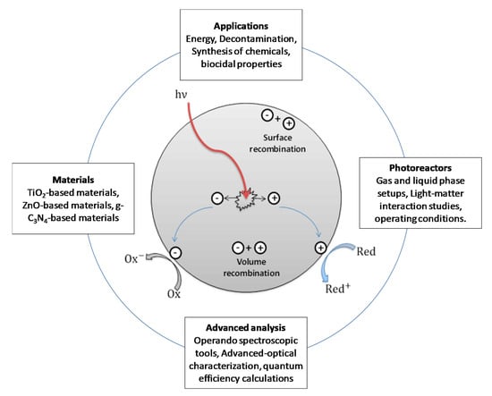 Heterogeneous photocatalysis is a subtype of catalysis that refers to chemical processes catalysed by a semiconductor solid under proper illumination conditions. As is well-described in related literature and schematically represented in Figure 1, the light-exited photocatalysts generate holes and electrons. The electrons and holes at the surface may initiate a reductive and an oxidative reaction pathway, respectively, which allow for the utilization of this scheme for a wide range of applications, from the selective organic synthesis of high-value products [1,2], production of energy toward CO2 reduction [3], water splitting and alcohol reforming reactions [4,5] to the degradation of undesired chemicals or pollutants and pathogens [5,6]. In addition, advantageously, the photocatalytic processes can be carried out in both gas and liquid media and using mild operating conditions [6,7,8,9]. TiO2- and TiO2-based materials are the most widely used photocatalysts. Such materials, in addition to ZnO-based and more recently g-C3N4-based materials (among many other semiconductors), have shown outstanding results in many photocatalytic applications [5]. Figure 1 also describes some of the open research lines in the photocatalysis field.