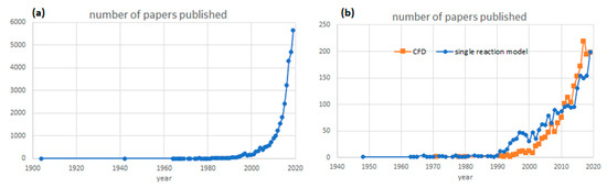 (a) Number of papers published every year with keywords “Solid Reaction” and “Chemical Engineering”; (b) papers published with keywords “solid reaction modelling” plus “single-particle model” versus “solid reaction modelling” plus “Computational Fluid Dynamics/CFD” according to Web of Science.