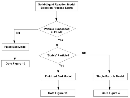 Figure 2 shows the general solid–liquid reaction model selection process that structures this review, which covers all the three main reactors commonly used in industrial applications, i.e., reactor with suspended particle, fixed bed reactor, and fluidized bed reactor. The reaction model and correlations for a single particle in suspension is first reviewed. Then the review is on particles in fixed bed, followed by reviews on particles in fluidized bed.