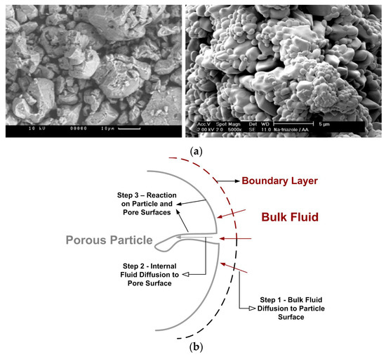 For porous particles, the reaction process includes bulk fluid diffusion, the fluid diffusion inside the pores, and surface chemical reaction, which is shown in Figure 6b: