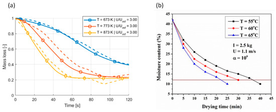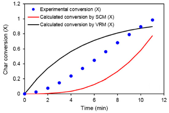 Namkung et al. [56] reported an evident deviation between experiment and simulation using both shrinking pore model and volumetric reaction model for combustion of char from biomass and coal particles, as shown in Figure 7. This shows that shrinking pore model and volumetric reaction model are not able to simulate porous particle reaction with a reasonable accuracy. Models dedicated to porous particle should be resorted to in this case.