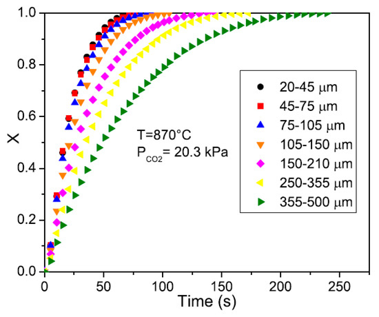 For the reactant solid with multiple particle sizes, Knorr et al. [12] has studied the effect of particle size distribution on the reaction rate for the production of carbide-derived carbon from silicon carbide. The Langmuir–Hinshelwood kinetics model, which is reported to represent the carbide chlorination process better than power law rate expression, has been used in the simulation [43]. They found a higher conversion rate when using the mean particle diameter, as shown in Figure 5. They attributed the slower conversion rate with particle size distribution than that with mean particle size to the large particles existed in particle size distribution, which slows down the reaction because of lower specific surface area and more evident diffusion effects.