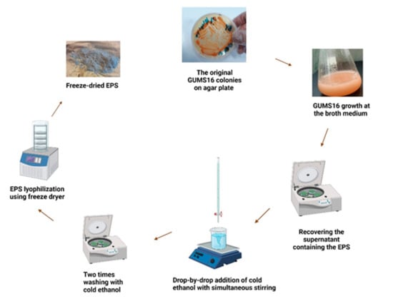 After incubation, the EPS containing media was centrifuged at 8500× g for 30 min at 4 °C and the supernatant containing the EPS was kept. The EPS was precipitated from the supernatant using the drop-by-drop addition of cold 96 wt.% ethanol with simultaneous stirring followed by overnight incubation at 4 °C. The precipitated EPS was also washed with cold ethanol followed by 8500× g centrifugation for 20 min at 4 °C. After evaporation of ethanol (i.e., when the mass of the EPS pellets remained constant), the resulting EPS pellet was dissolved in distilled water, frozen and lyophilized using a freeze dryer instrument (Christ Alpha 1-2 LDplus, Nemacka, Germany). Finally, the mass of EPS produced was measured using a precision analytical balance (Sartorius Quintix®, Göttingen, Germany), in g. The yield was reported as the mass of EPS in g per 100 mL of the substrate and denoted as YEPS. Figure 1 shows the schematic diagram of the EPS extraction and recovery process.