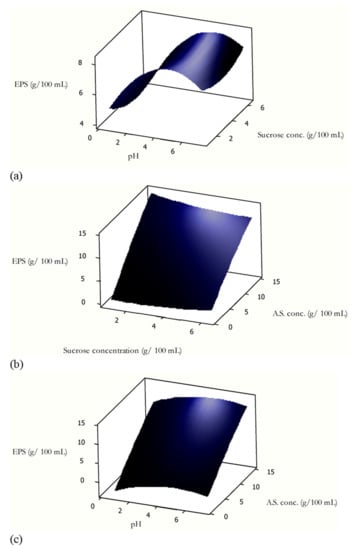 Figure 2b highlights a positive correlation between the ammonium sulfate concentration (i.e., nitrogen source) and the EPS yield since EPS yield increases from ~0.19 to ~13 g/100 mL as the concentration of ammonium sulfate increases from ~1.27 to ~14.73 g/100 mL. This observation indicates the favorable role of nitrogen on EPS production by Rhodotorula mucilaginosa sp. GUMS16. However, a critical review of existing literature shows significant variations in the effect of higher nitrogen concentrations on EPS yield. Some previous reports showed that higher nitrogen presented unfavorable effects on the EPS yield by P. acidipropionici and on the other hand, favorable effects on EPS production by S. thermophilus [].