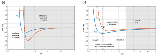 Diagram illustrating (a) the 12-6 potential used for the no-penetration conditions and (b) the 4-2 potential used for particle agglomeration. In both cases, the cut-off is selected so that only the white area of the diagram is used in the potential. This implies that (a) is only repulsive because only the positive part is considered, while in (b) the negative part of the force, which is attractive, is considered; particles tend to agglomerate at the location where the force is zero, which is where is the minimum of the potential is located.